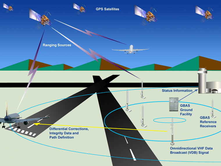 GBAS is an airport‑based, local augmentation system that provides precision approach guidance. It enhances GNSS performance by transmitting differential corrections and integrity information to aircraft. Differential corrections remove part of spatially correlated errors between the ground station and the aircraft, while integrity data let the airborne system estimate safe bounds on position errors.